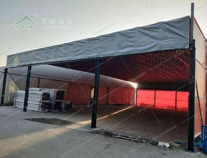電動推拉篷可用于工廠臨時倉庫,大型活動場所,大排檔,室外遮陽。